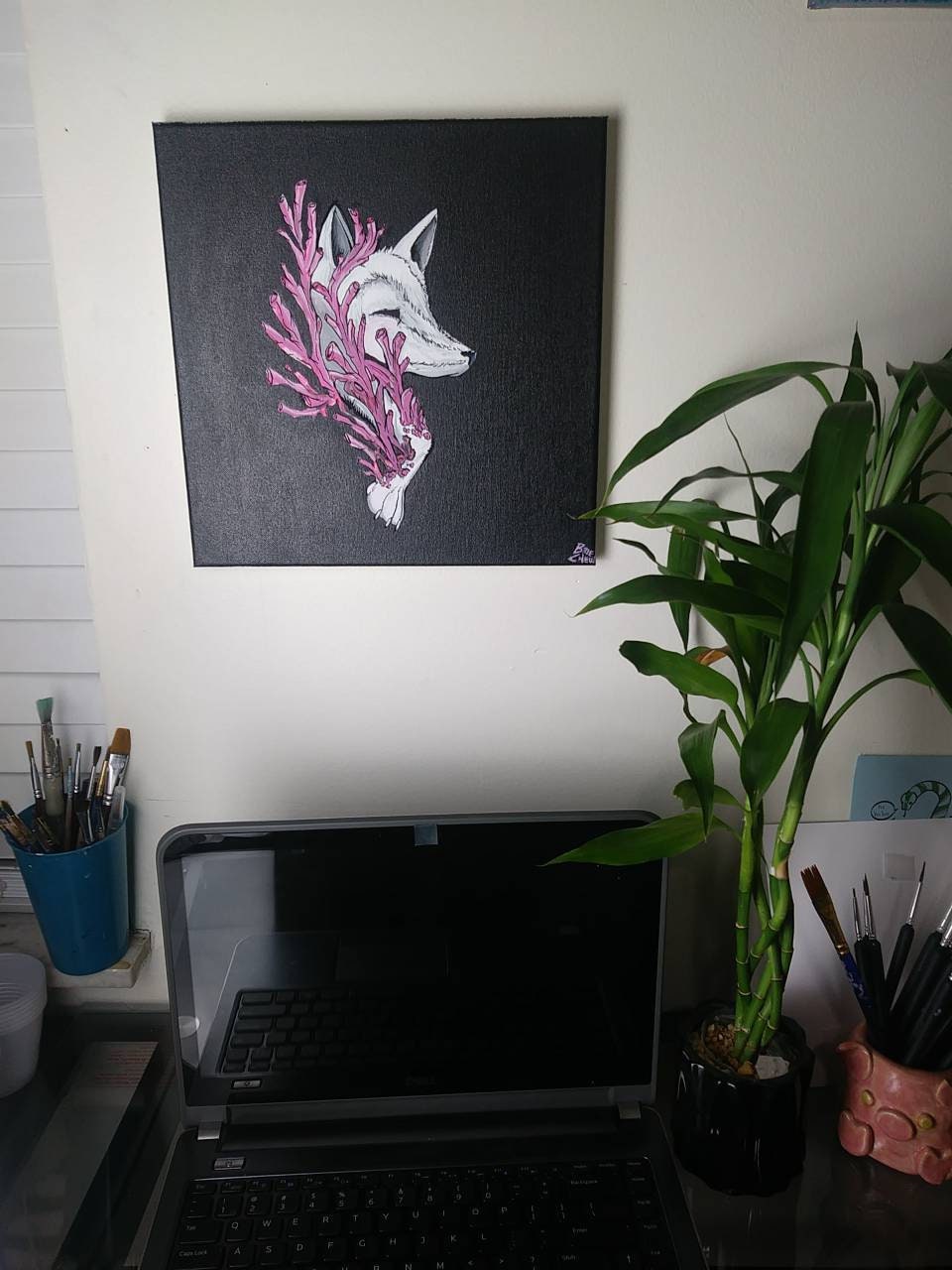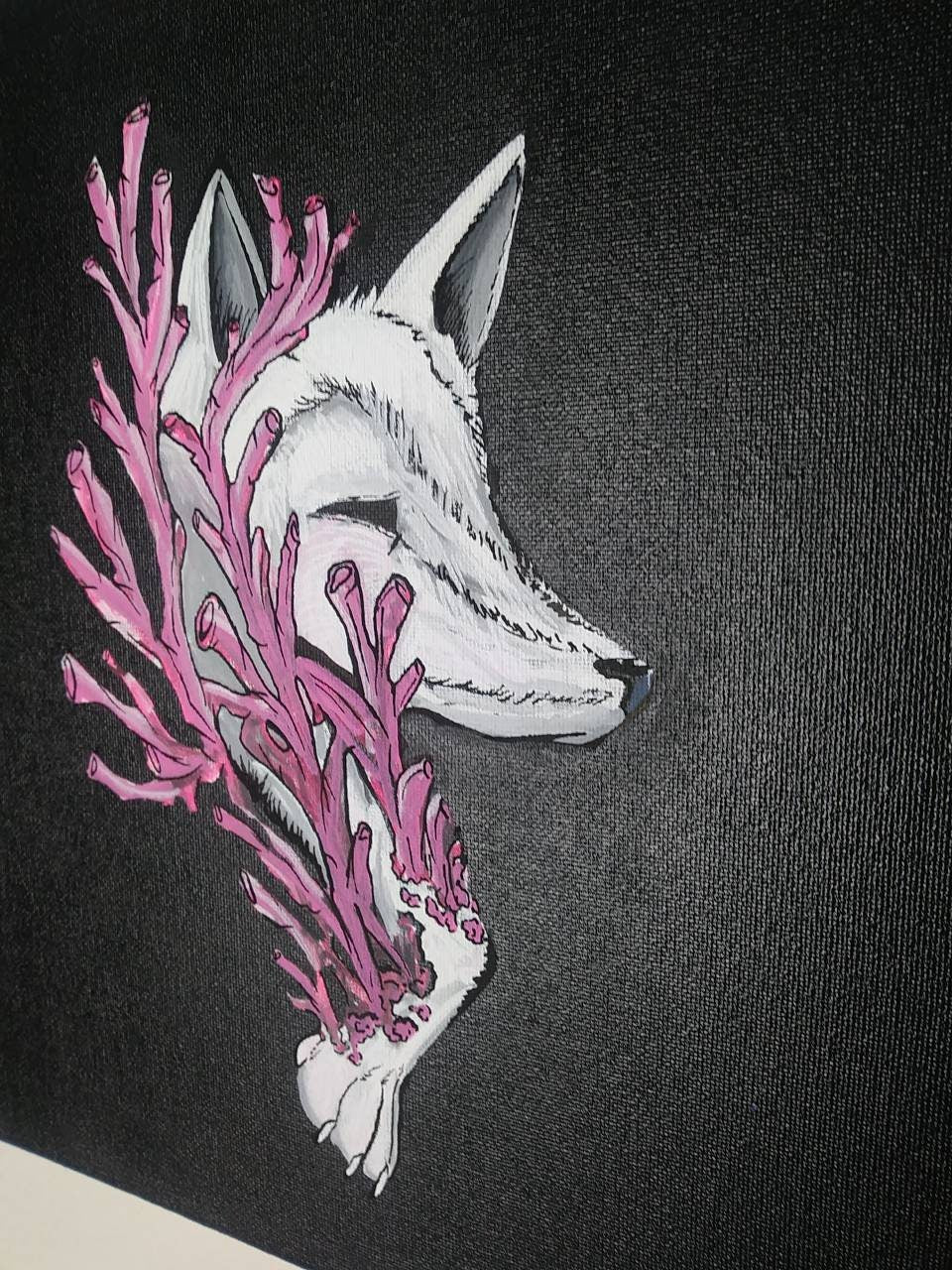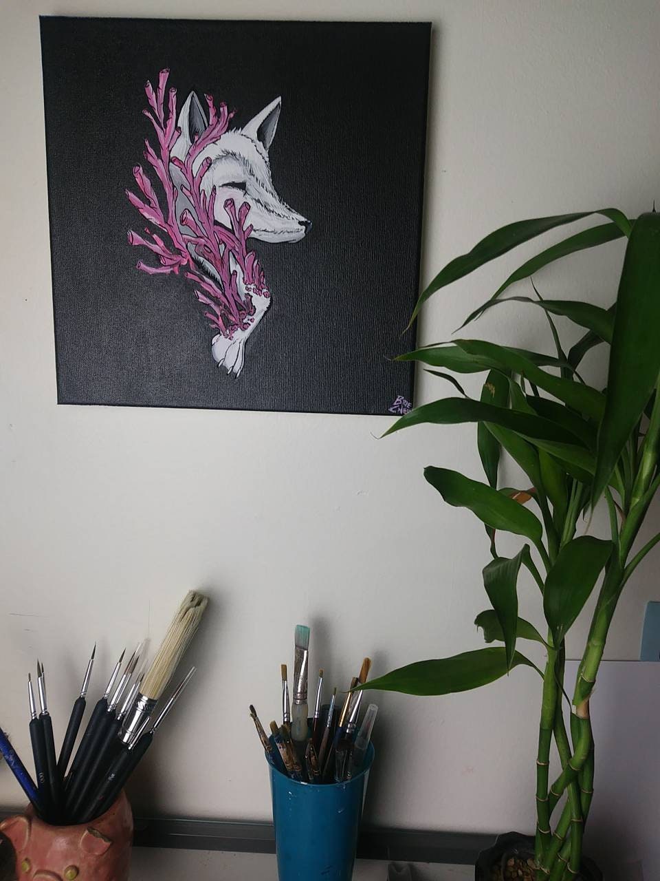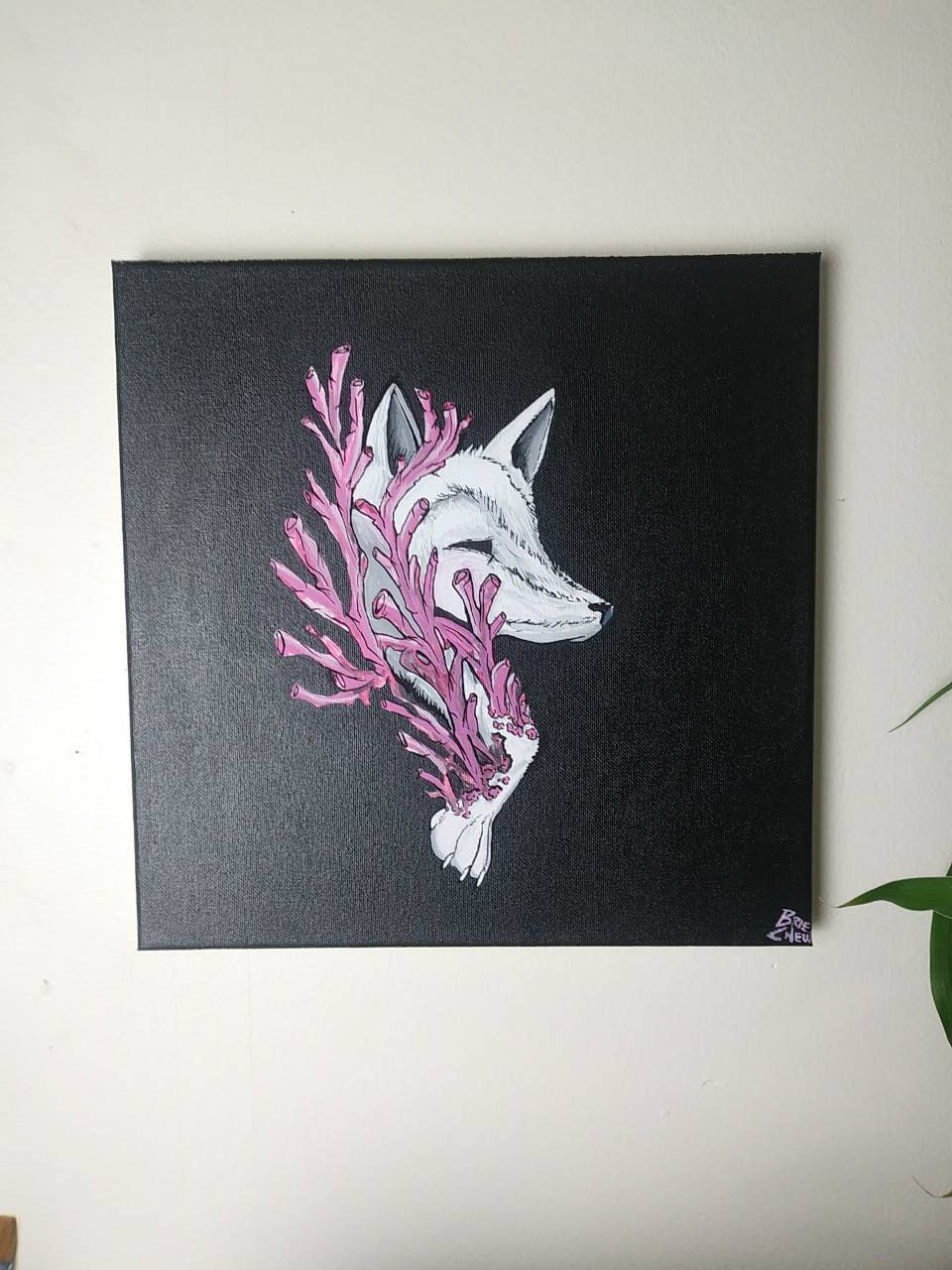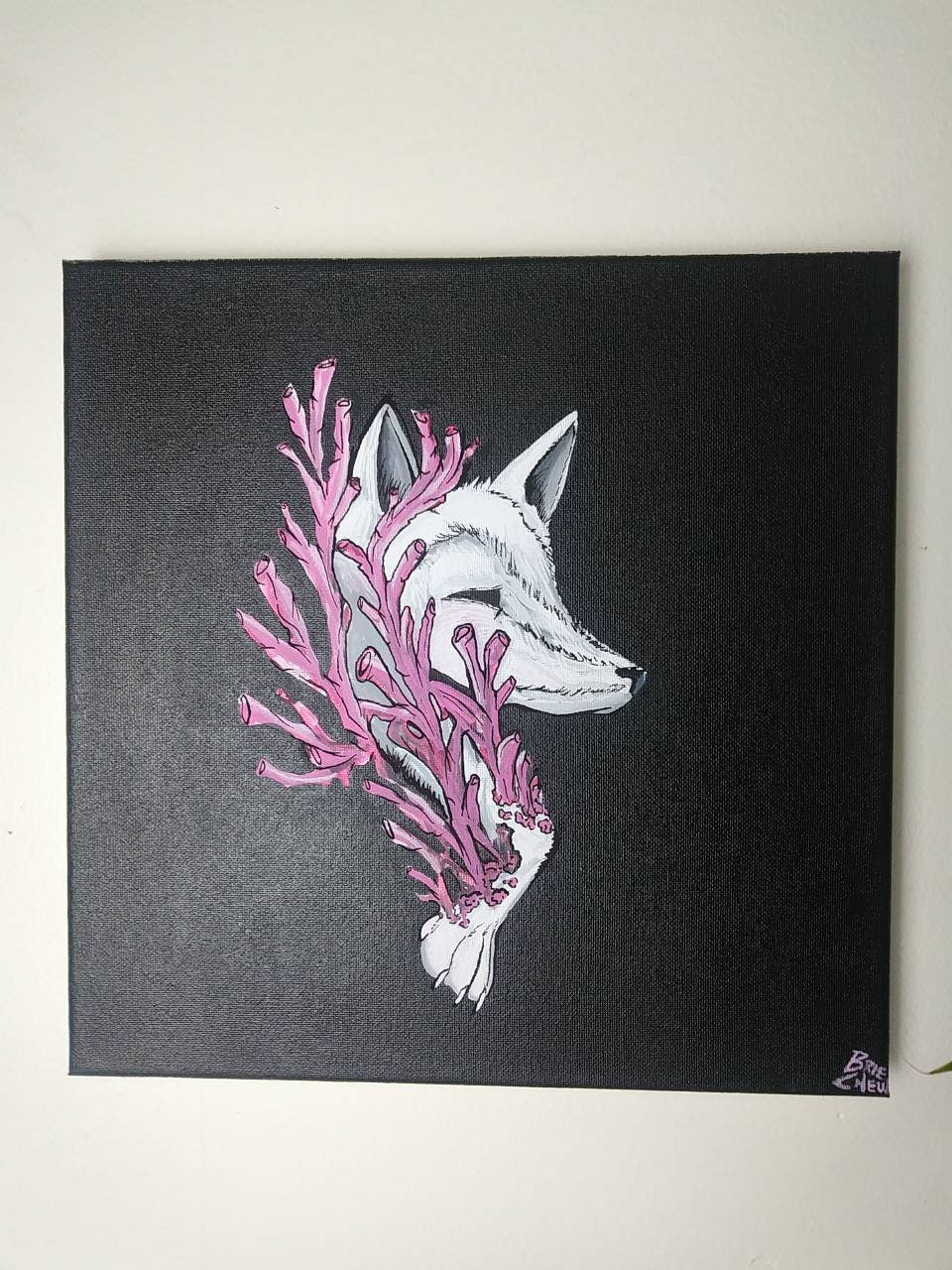 Hand-painted Coral Fox acrylic painting: 12x12 in size, painted using acrylic paints, and varnished for protection.
